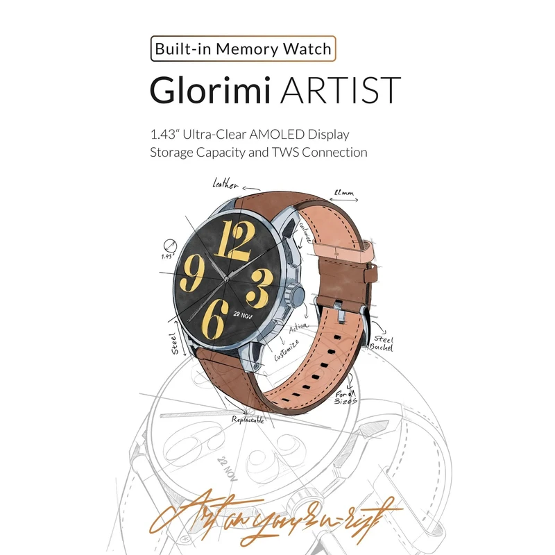 Glorimi Artist یکی از ساعت های هوشمند با طراحی کلاسیک (صفحه گرد) و امکانات فنی کامل این برند است که بیشتر برای استفاده رسمی، روزمره و ورزشی طراحی شده است. این ساعت ترکیبی بی نقص از طراحی کلاسیک دایره ای و عملکرد پیشرفته است. این ساعت با نمایشگر 1.43 اینچی AMOLED فوق العاده روشن (1350 نیت) و وضوح 466 \times 466 پیکسل، تجربه بصری لوکسی را ارائه می دهد